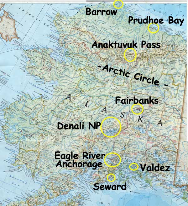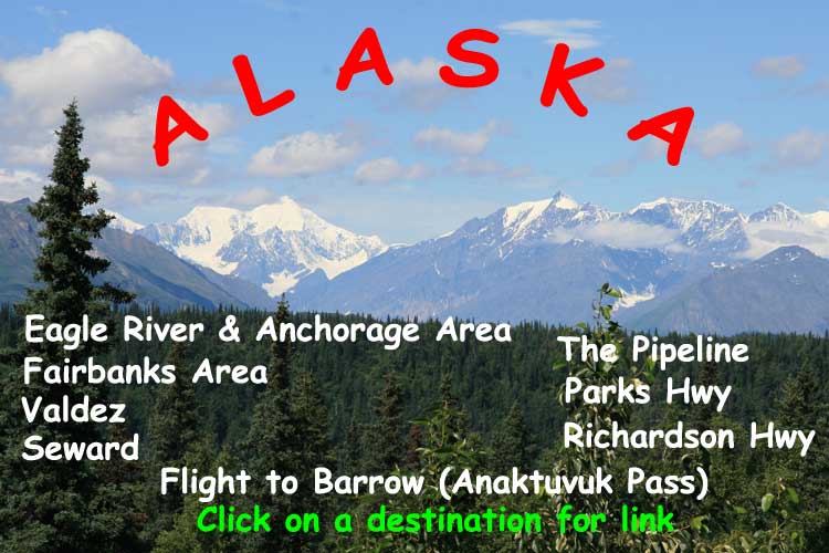On July 16, 2006, we flew from San Diego to Anchorage to enjoy two weeks in America's Last Frontier - ALASKA. We stayed with our friends Bob & Cherie Clark, who live in Eagle River, just a short drive north of Anchorage. In a rented car, we drove south on July 19th to Seward on the Kenai Peninsula. (We drove a total of 2,193 miles on that car before we turned it in.) On the 20th & 21st we visited Valdez, just south of the Chugach Mountain Range. On July 24th, we drove north on the Richardson Highway to Fairbanks. We spent a grand time exploring the city and some of its features & activities, including learning about the Trans-Alaska Pipeline. On July 26th we boarded a small chartered plane for a flight to Barrow, above the Arctic Circle and the furthest north city in North America. Unfortunately, just a short distance away from Barrow, the weather closed in on us. (Temp in Barrow, 32 degrees, with a dew point of 32 degrees - result: cold fog. Lot's of it.) All chartered flights, and even an Alaska Airlines flight were turned away that day. So we landed instead in Anaktuvuk Pass, a small (population about 300) native village. We spent a delightful several hours learning about the Land of the Nunamiut. Someday, perhaps next year, we hope to return to that area above the Arctic Circle for some additional explorations in these vast open spaces. We returned to Eagle River along the Parks Highway passing Denali National Park, with Mt. McKinley, at 20,320 feet, gleaming in the sun for us. For now, we just hope you will enjoy exploring what we visited, through our camera lens.